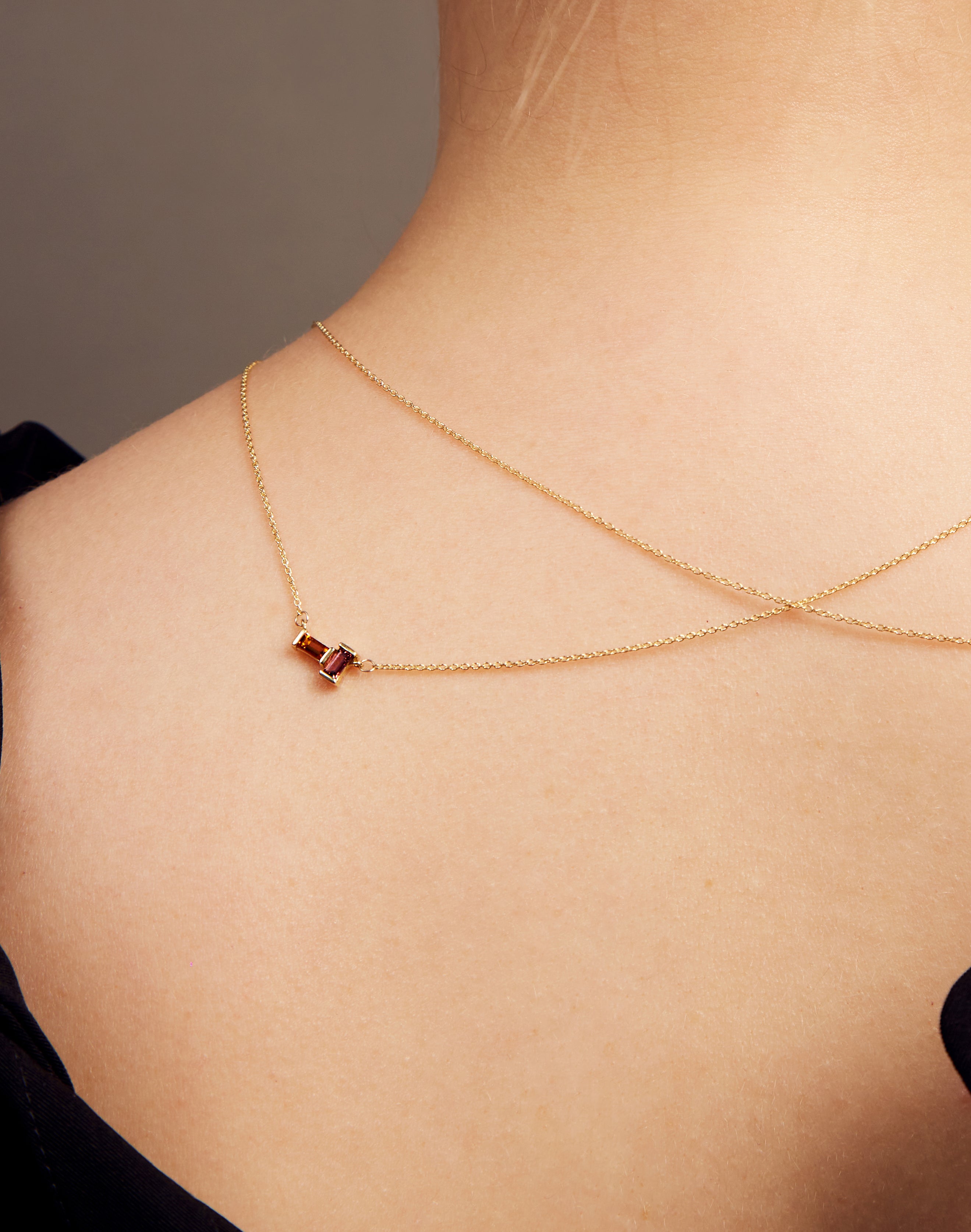 Color, light and elegance, Tu y Yo (you and I) necklace with “baguette” cut citrine and pink tourmaline is unique and special like you! Gift yourself with a subtle yet precious jewel that is perfect to wear everyday. We suggest mixing it with our yellow gold necklaces from Pura collection.