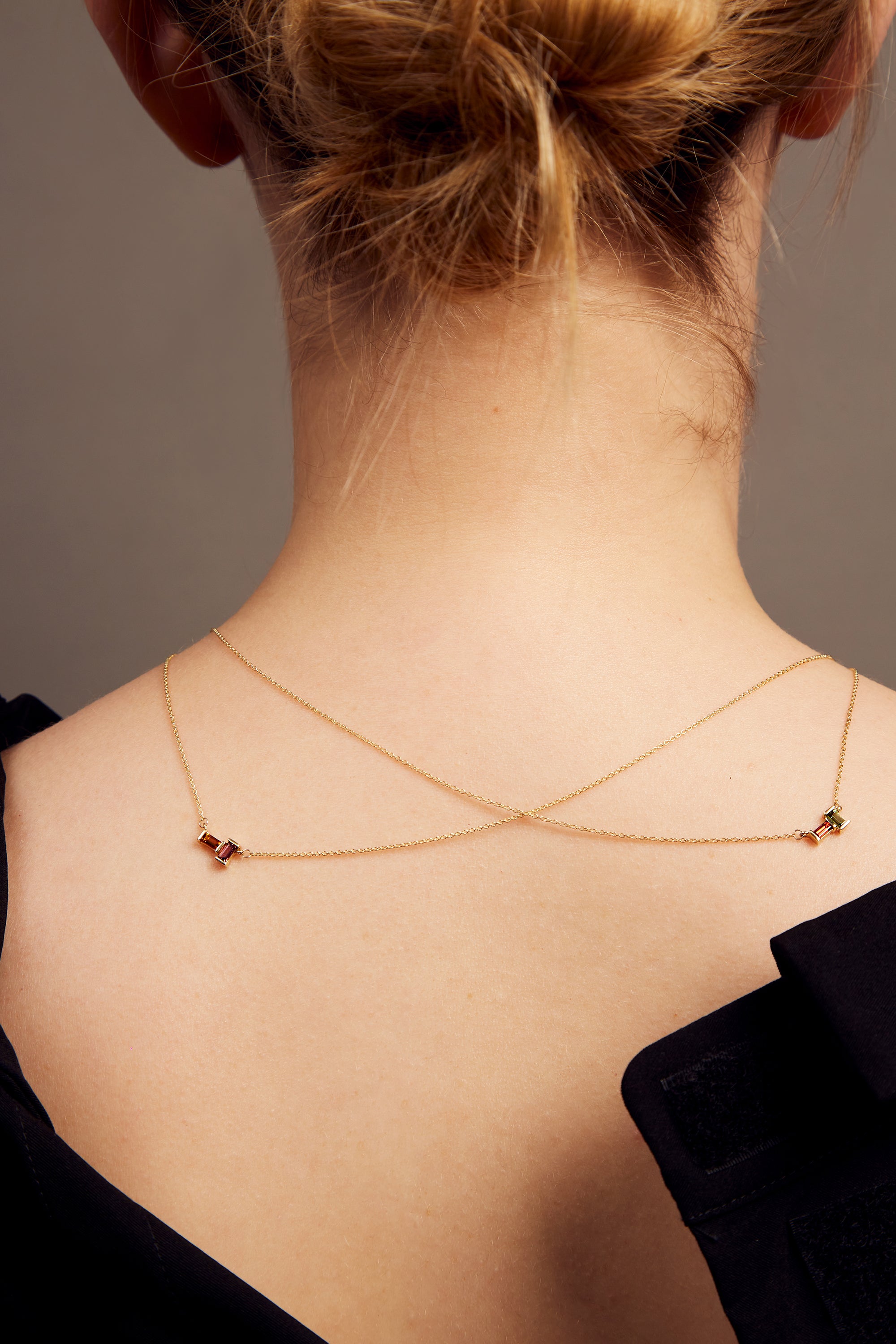 Gold rolo chain necklace with a baguett cut citrine and a baguette cut pink tourmaline on woman