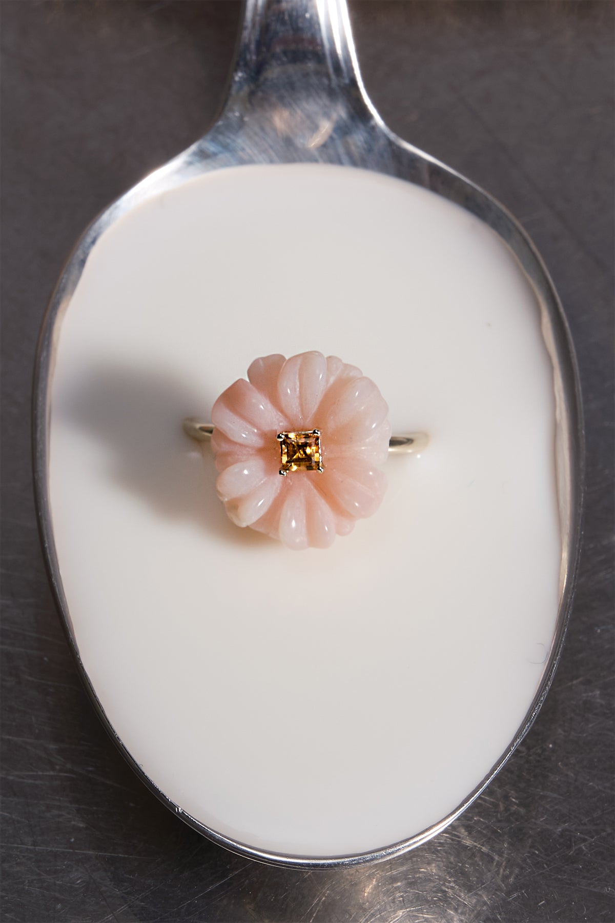 Blushing like a rare blossom at golden hour, this hand-carved pink opal flower ring captures the romance of a flourishing garden. A carré-cut citrine gleams at its core, radiating sunlit warmth and transforming this fine gemstone ring into a bold yet poetic statement piece.