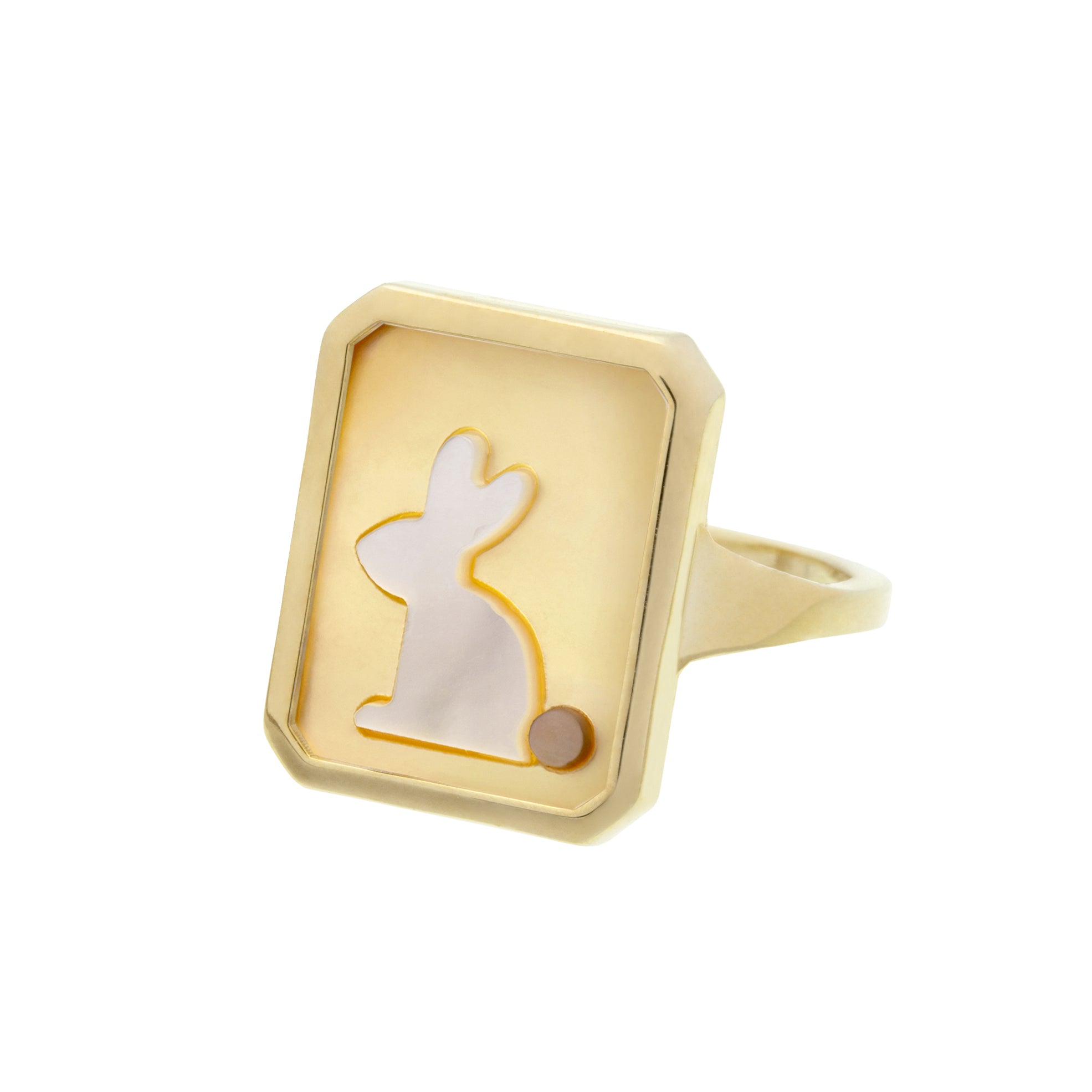 A gentle creature, always close at hand. The Cameo Perla Conejito ring showcases a tiny white rabbit centered on a soft yellow mother of pearl base — a subtle contrast created through fine marquetry. Each piece is cut and placed by hand to form a miniature scene full of warmth and quiet charm. Framed in 9kt yellow gold, it’s a playful yet elegant addition to your jewelry collection.