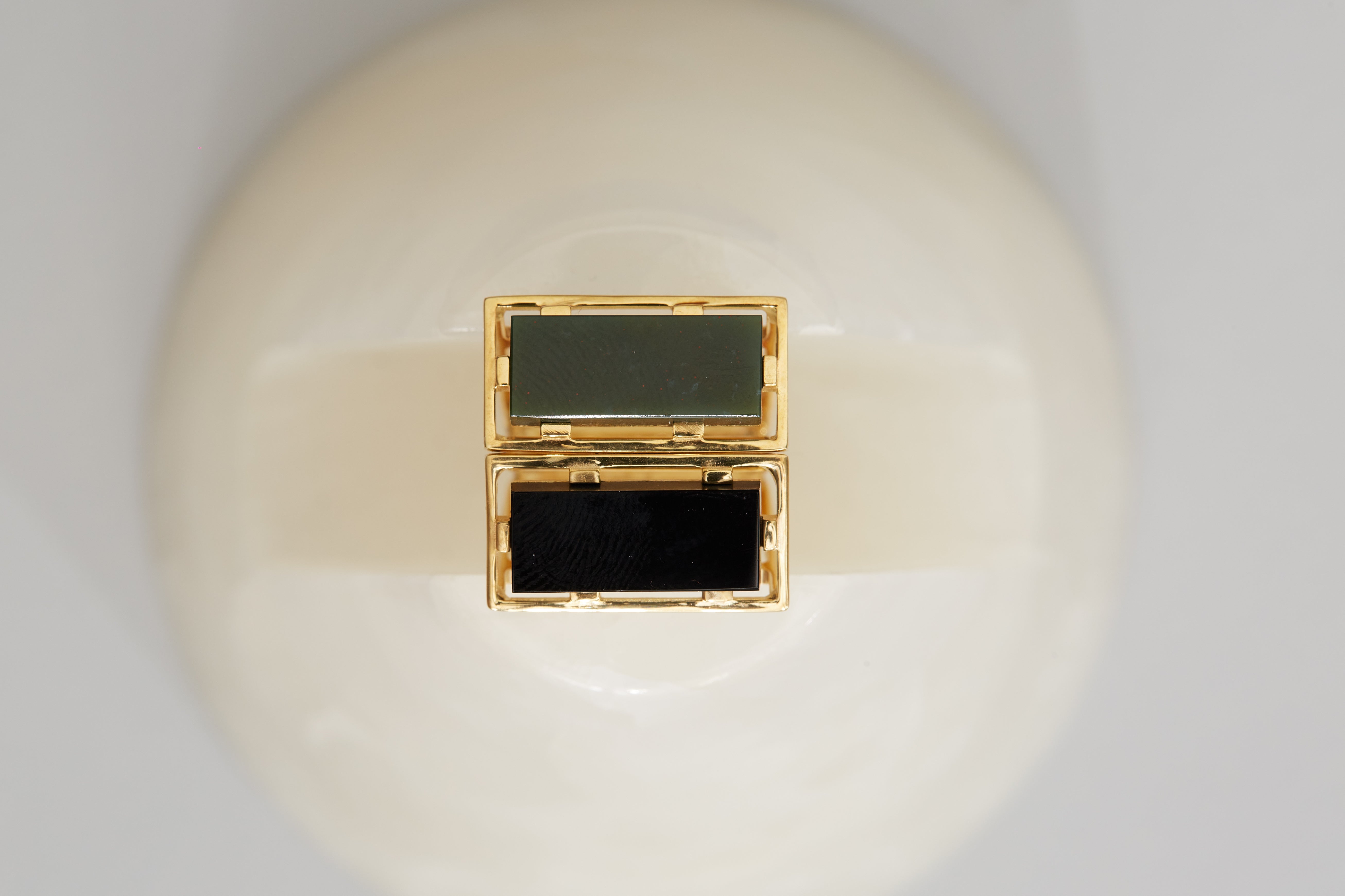 Gold square rings with black agate and jasper stones