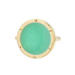 The Oblò is a unique porthole-shaped ring that features a cabochon-cut chrysoprase stone. The smooth, polished surface of the stone catches the light and reflects a vibrant green hue, reminiscent of exotic waters.
