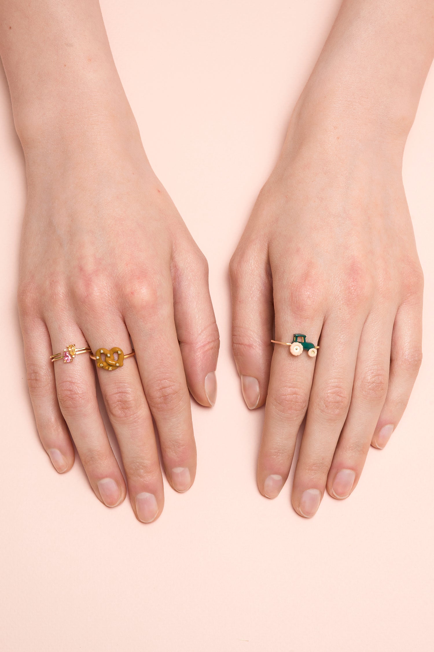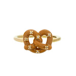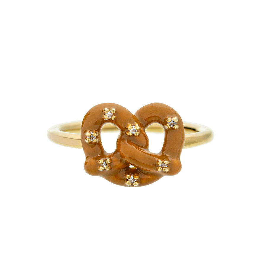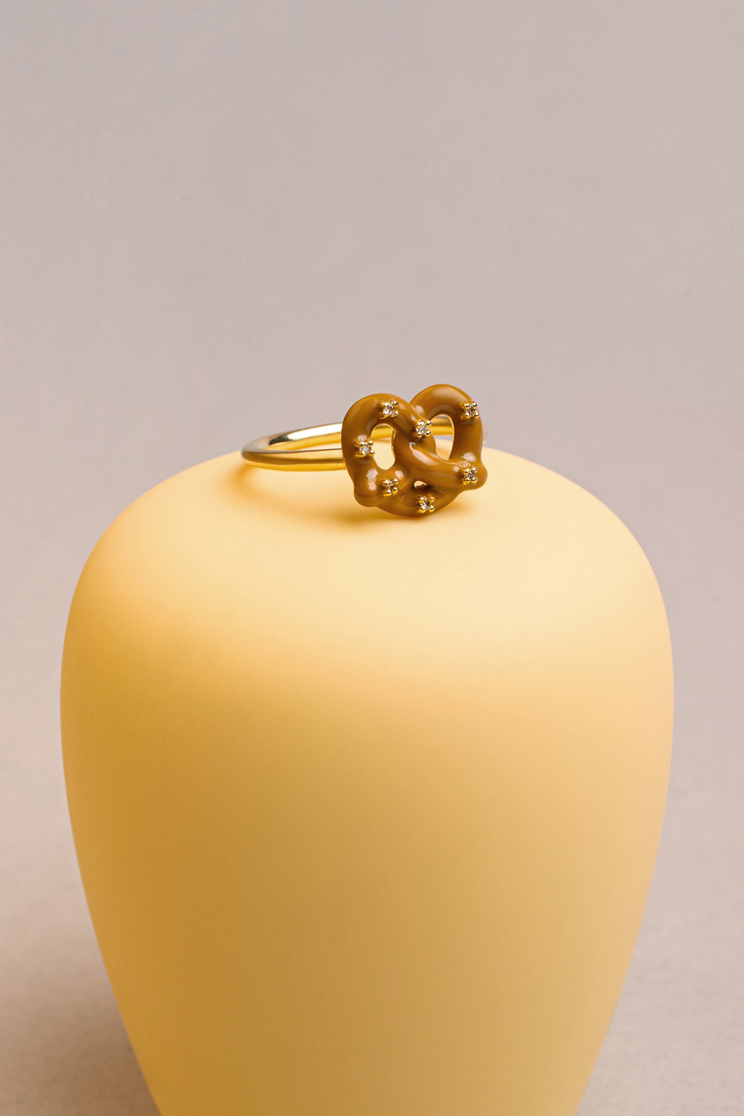 Savor the unique charm of our Pretzel ring. Crafted in lustrous gold and enameled in a warm caramel brown, this playful design is topped with tiny diamonds that sparkle like salt on a pretzel. A fun yet luxurious piece, this ring brings a touch of whimsy and sophistication to any look. Treat yourself to a sweet, stylish statement that’s as delightful as it is elegant.
